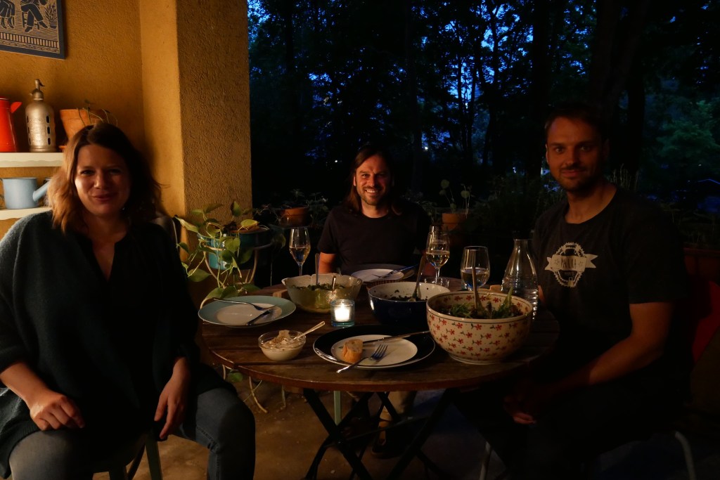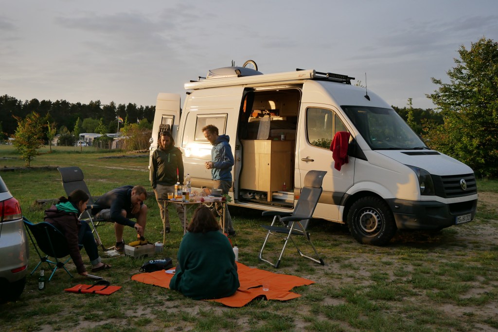 Wer hätte gedacht, dass wir uns so schnell wiedersehen! Vor knapp zwei Monaten erst voneinander verabschiedet, genießen wir die Tage mit unseren Berliner Freunden Alexes & Miri, Klemens & Veronika, Mario & Sarah, Theresia & Stefan, Linus & Nuna und Ricarda & Bernd sehr. Wir verbringen schöne Abende an Lagerfeuer und Grill und schöne Tage am See. Gleichzeitig merken wir, dass die Großstadt nichts für Wuddi ist. Wir schlafen unruhiger und finden den Verkehr stressig. So übernachten wir gleich zweimal etwas außerhalb: in der Gartenoase von Ricarda und Bernd und am Liepnitzer See nahe des Häuschens von Theresia und Stefan.