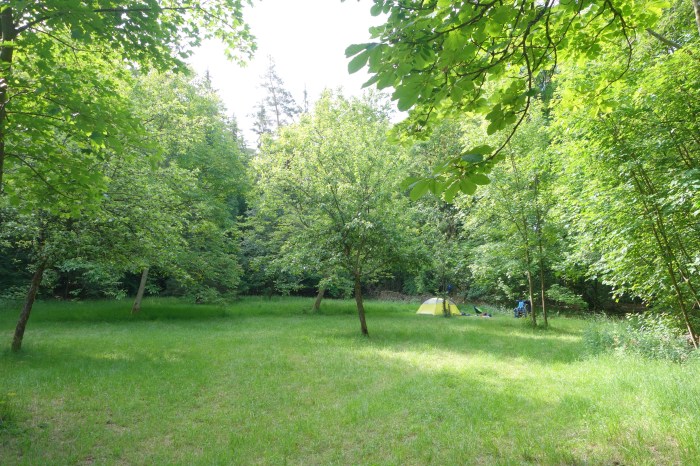 Der Trekkingplatz liegt mitten im Wald und ist mit Feuerstelle, Obstbäumen und charmantem Plumpsklohäuschen ausgestattet. Eine Dusche ist schnell aus einer Plastikflasche mit Löchern im Deckel improvisiert. Wie einfach doch gut ist!