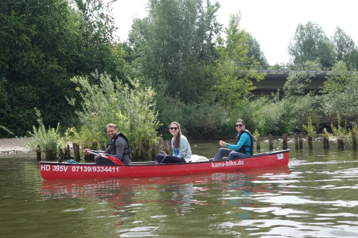 Glücklicherweise verbringen wir die meiste Zeit ja auf dem Wasser. Highlight sind die Bootsrutschen: Die Altmühl fließt mit starker Strömung zwei Wasserwehre herab. Für uns heißt das, mit dem Kanu gerade in die Hauptrinne steuern, loslassen und runter geht’s. Was für ein Spaß! Vor allem für denjenigen, der vorne sitzt, im ersten Fall Hendrik. Er wird pitschnass. Hendriks Neffen und wir haben eine Riesengaudi. Ebenso die Gruppe von Wildwasserpaddlern, die unten am Wehr übt. Das Ganze wiederholen wir mehrmals. Am Ende sind wir alle naß. Gleichberechtigung ;).