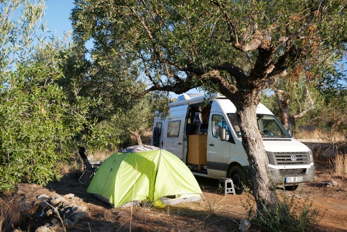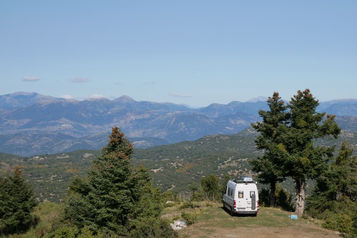 Neben uns heben die Gleitschirmflieger ab und fliegen gen Meer. Unten am Kai legen die Fähren an und ab. Wir fahren weiter gen Zentralpeleponnes in die Region Arkazien. Hier wollen wir einen Teil des Menalon-Trails wandern und Mountainbiken. Wir parken Wuddi unter wuchtigen, knorrigen Bäumen neben einer alten Steinkapelle. Ein Baum so breit und verzweigt, dass er locker für drei Bäume gereicht hätte. Überhaupt fasziniert mich immer wieder, wie Bäume wachsen: verschlungen, sich umarmend, auseinanderstrebend, Zwillingsstämme, krumm, verwinkelt, unvorhersehbar gewachsen, wie das Leben. Und einige der ausladenden einladenden Bäume unter denen wir in den letzten Monaten gestanden haben, hätten so viel spannende Geschichte zu erzählen!