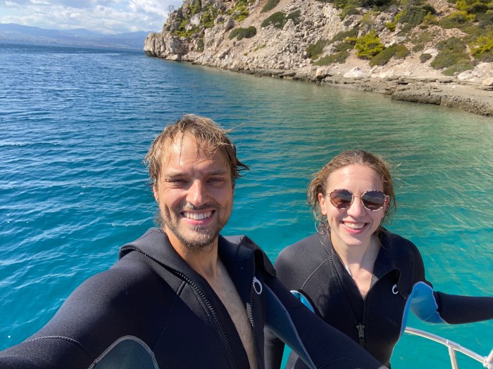 Die Umgebung um Meteora lädt zum Wandern, Klettern und Mountainbiken ein. Nach zwei Tagen geht es für uns jedoch weiter. Wir haben eine Verabredung in Patras. Meine Schwester Eva kommt spontan für eine Woche zu uns und wir wollen gemeinsam die Peleponnes Halbinsel erkunden. Wir freuen uns auf das Wiedersehen und die Zeit zu dritt und improvisieren Wuddi einen weiteren Sitz. Gemeinsam suchen wir die schönen und interessanten Orte auf dieser, von Natur und Kultur reichen Halbinsel auf: karibisch anmutende Strände, das antike Olympia, Dörfer mit alten Steinhäusern und einladenden Cafés und Tavernen. Wir wandern zu alten Festungen, in die Gebirgsausläufe und durch Olivenhaine, machen eine Radtour auf einer kleinen Insel, gehen schwimmen, schnorcheln und Hendrik und Eva tauchen. Und lecker essen. Mal schläft Eva in einem Hotel oder B&B nahbei, mal zusammen mit mir im Schwesternzelt. Wir genießen das Sommerwetter und fühlen uns jetzt mehr als Urlauber denn als Reisende.